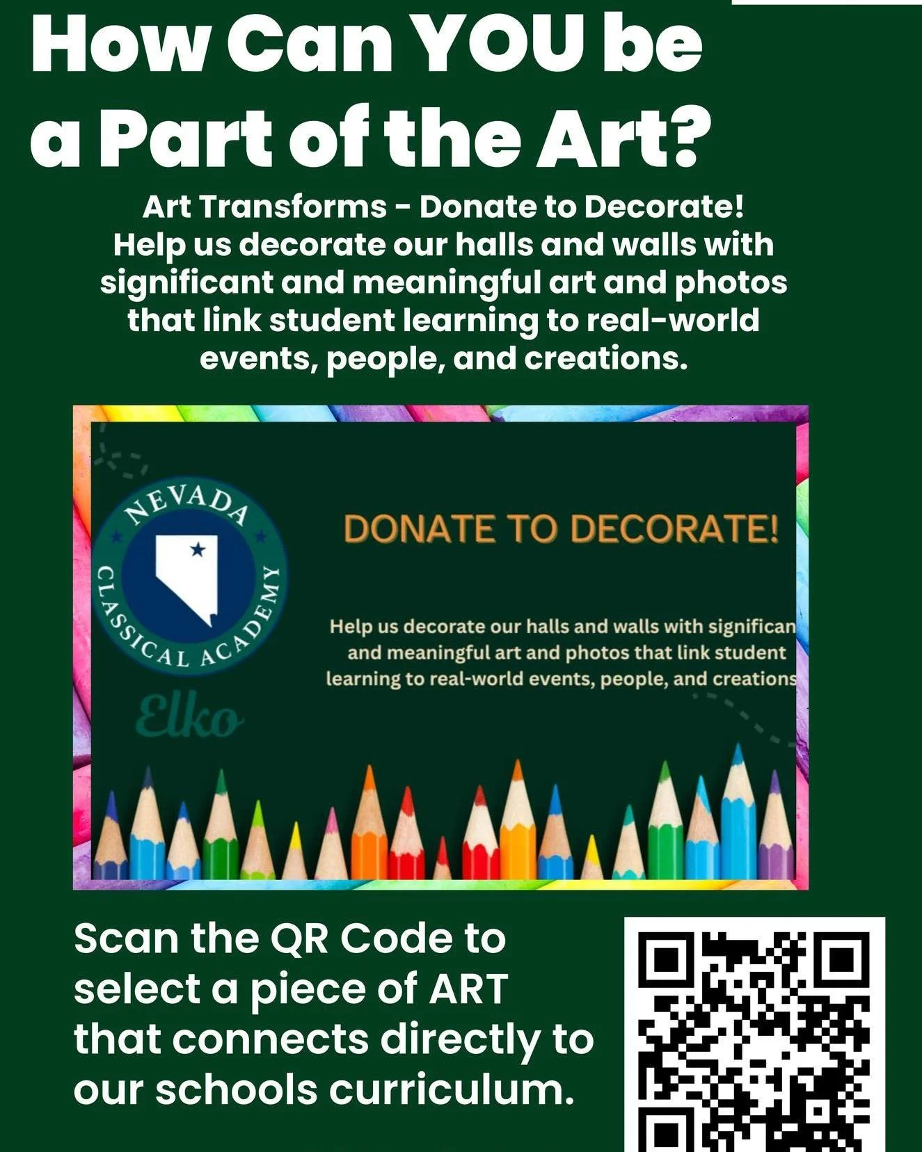 Help us decorate our halls and walls with significant and meaningful art and photos that link student learning to real-world events, people, and creations.